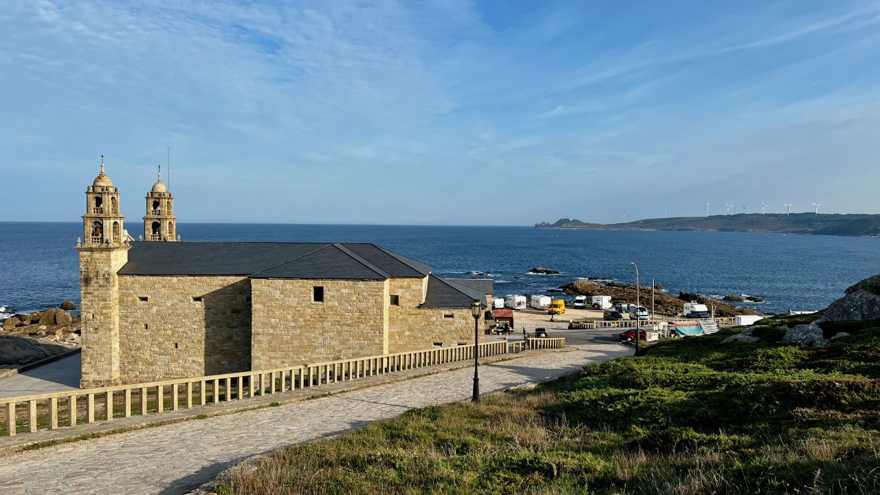 Besonders eindrucksvoll ist die Kirche Santuario da Virxe da Barca e Pedras da Barca, die direkt neben dem Leuchtturm am Zipfel der Landzunge steht. Sie ist Teil des Jakobswegs und zieht Pilger wie auch Bustouristen an. Am späten Nachmittag war es zum Glück ruhig, sodass wir die Kirche fast für uns hatten – allerdings nur einen Blick durchs Fenster erhaschen konnten. Hinter der Kirche gab es neben einigen Handwerksständen auch frisch gebackene Churros – ein traditionelles iberisches Fettgebäck.